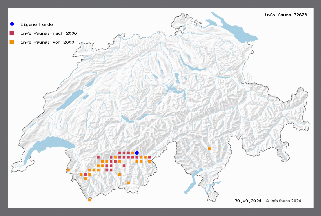 Der südliche Falter kommt nur im Wallis und in den Südtälern Graubündens vor, ist aber dort an warmen, sonnigen Plätzen nicht selten. Er fliegt im Juni-Juli und erreicht noch 1600 m Höhe (Zermatt, V.).