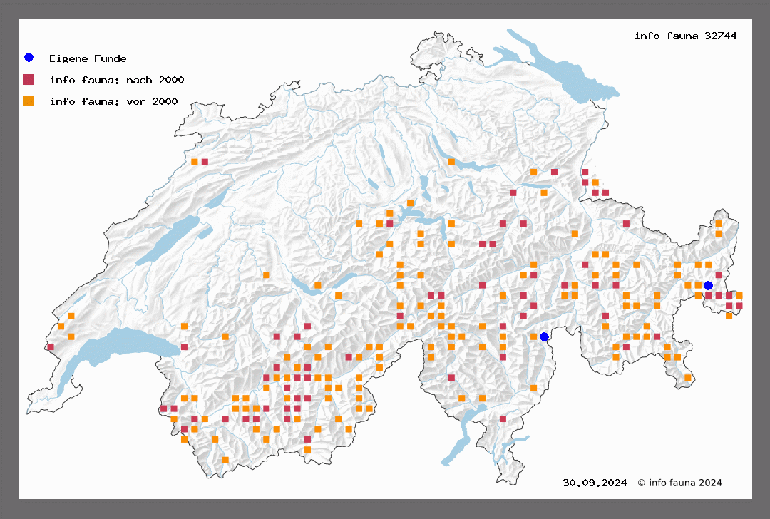 Thusis (V.), Göschenen (Hoffm.), Erstfeld (L.), Alpen von Chamonix (G.), Col de Balme (W.), Zermatt (Roug.), Engstlenalp, Gadmental, Triftal (St., V.), Orvin, Biel (Rob.), Tramelan, Moulin de la Gruyere (G.), Stilfserjoch (Struve, Settari), Weissenstein, St. Moritz (Cafl.). Der Falter ist zwar meistens lokal, aber an den Orten seines