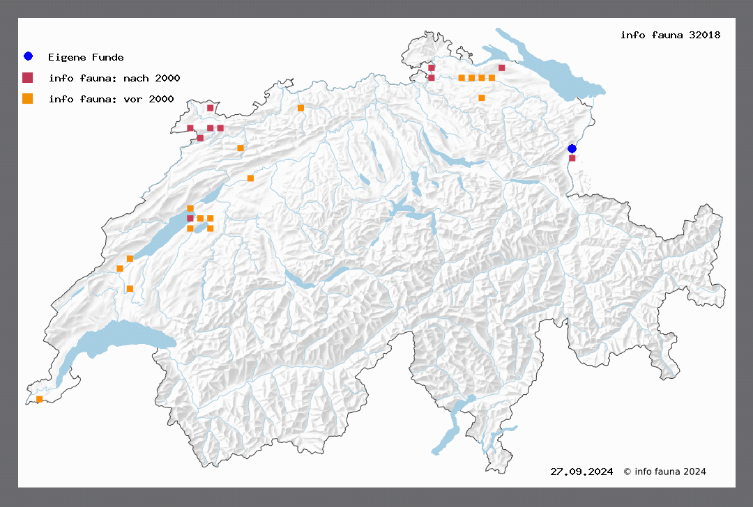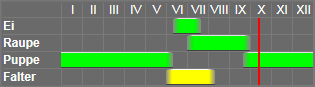 Ist bei uns die seltenste Art ihrer Gattung. Flugzeit im Juli-August. Bern (v. J.), Büren (Ratz.), Burgdorf (Müller), Allschwil (Mory), Frauenfeld (Wehrli), Oftringen (W.), Montier, Yverdon (Roug.), Liestal (Seiler), Aadorf (Z.-R.), Zürich (Rühl). Bei Albisrieden und an der Baldern fand Gröbli den Falter in Mehrzahl an den Föhrenstämmen sitzend. Er erreicht im Nikolaital etwa 1200 m Höhe (v. J.). Die Raupe - Sp. IV, T 21 - lebt an Weissdorn, Schlehen und Pflaumen von Juli bis September. Bei der Zucht wurden die Eier anfangs Juni abgelegt. Die Raupen schlüpften nach 14 Tagen und wurden dann im Freien aufgebunden. Die junge Raupe sitzt unter den Blättern versteckt und frisst das Chlorophyll heraus, so dass die Blätter durchscheinend werden. Später sitzt sie dann auf der Blattoberseite. Nach der fünften Häutung sind die Raupen erwachsen
