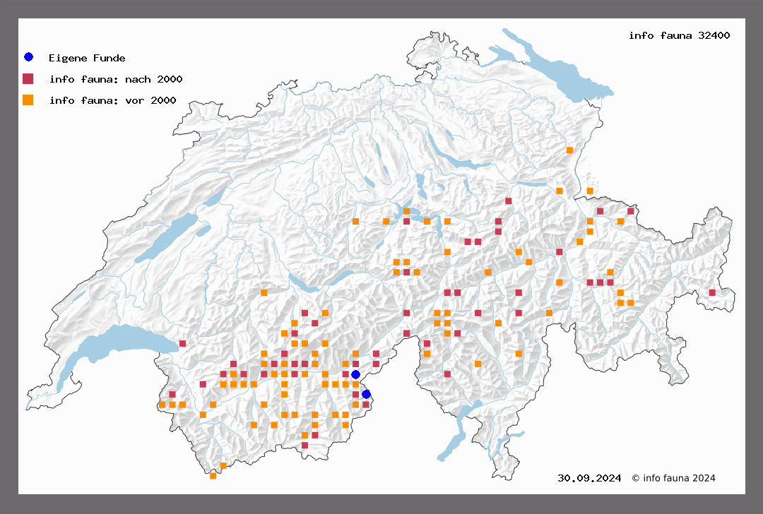 Der Falter ist wenig verbreitet und ein seltenes, geschätztes Tier. Er fliegt von Ende Juni an durch den Juli hindurch, hauptsächlich als alpines Gebirgstier, meist etwa von 1300 bis etwa 2200 m Höhe. Gadmental (Rätz., St., V.), Murren (Beut.), Chamonix (B.), Col de Balme (Favre), Trient (W.), Simpeln (v. J., V.), Simplon (Rätz.), Zermatt, Riffelalp (Püng., Roug.), Salgesch (Roug.), Turtmantal (Z.-R.), Rochers de Naye (Stierlin), Samaden (Kill.), Splügen (Honegg.), Davos (Hauri), Oftringen (?, W.). Die der albimacula Bkh. ähnliche Raupe fand Püngeler bei Zermatt an Lychnis rupestris.