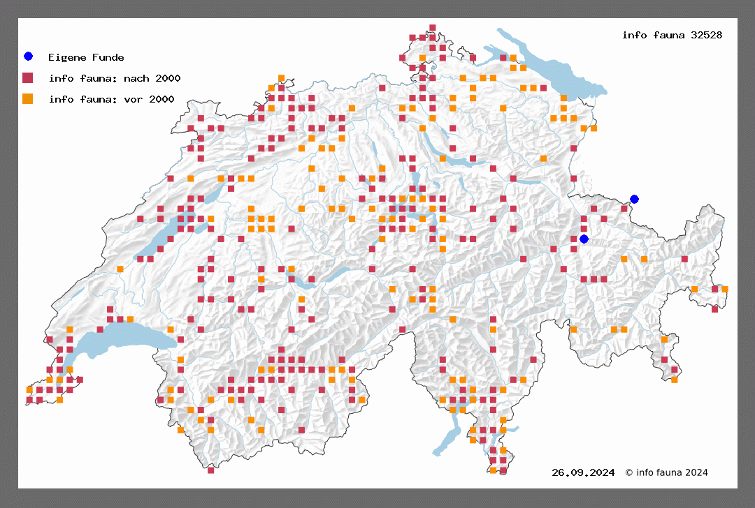 565. vitellina Hb. - Stz. III, T 23 - Sp. III, T 43. Der Falter ist in der Ebene, dem Jura und den Voralpen weit verbreitet, aber meistens lokal und seltener. Flugzeit von Mai bis Oktober. Der Falter geht im Engadin bis etwa 1800 m. Gais (M.-R.), Dübendorf (V.), Zürich (Nägeli), Oftringen, Lenzburg (W.), Bechburg (R.-St.), Liestal (Leuth.), Bözingen (V.), Biel (Rob.), Dombresson (Roug.), Büren (Ratz.), Bern (v. J.), Grassier (Loriol), Conche (Aud.), Martigny, Follaterres, Branson (W.), La Croix, Mt. Ravoire (Favre), Sion, Sierre (Paul), Salgesch (Roug.), Erstfeld (L.), Göschenen (Hoffm.), Engadin (V.), Sils (Z.).