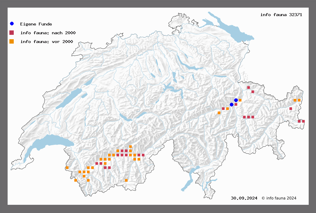Diese schöne Art ist im Kanton Graubünden, im Wallis und Jura melirfach, aber stets als seltenes Tier erbeutet worden. Flugzeit in einer Generation von Ende Juni bis im September. Aus im Mai bei St. Blaise gefundener Raupe erhielt ich einen Falter im VIII. 1910; Sulzer fing ihn bei Zermatt (1620 m) noch am 12. IX. 1910. Mt. Ravoire, Martigny, Branson (Favre), Tarasp, Nairs (Kill.), Chur (Cafl.), Ilanz (Caveng), Oftringen, Aarburg (W.), Bechburg (R.-St.).