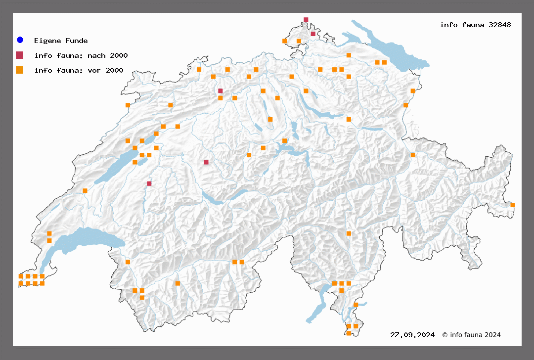 1242. cucullatella L. (= palliolalis Hb.) - Sp. III, T 72 - Stz. II, T 10 - B. R. T 47. Ist zwar viel verbreiteter als die folgende Art, aber durchaus keine häufige Erscheinung. Der Falter liebt trockene, buschige Halden und birgt sich tagsüber in Stammritzen. Flugzeit im Juli-August. Aadorf (Z.-R.), St. Gallen (M.-R.), Zürich öfter (Nägeli), Balgrist (Z.-D.), Bremgarten (Boll), Olten, Aarburg, Lenzburg (W.), Büren, Siselen (Ratz.), Weissenburgschlucht (Hug.), Frutigen (Uffeln), Biel (Roh.), Montier (Girod), Donibresson (Roug.), Liestal (Seiler), Basel (Honegg.), Bern (v. J., V.), Pt. Saconnex (Mong.), Mt. des Ecotteaux, Mt. d'Autant (Favre), Martigny (W.), Brig (And.), Ilanz (Caveng, V.), Igis, Landquart am Licht (Thom.).