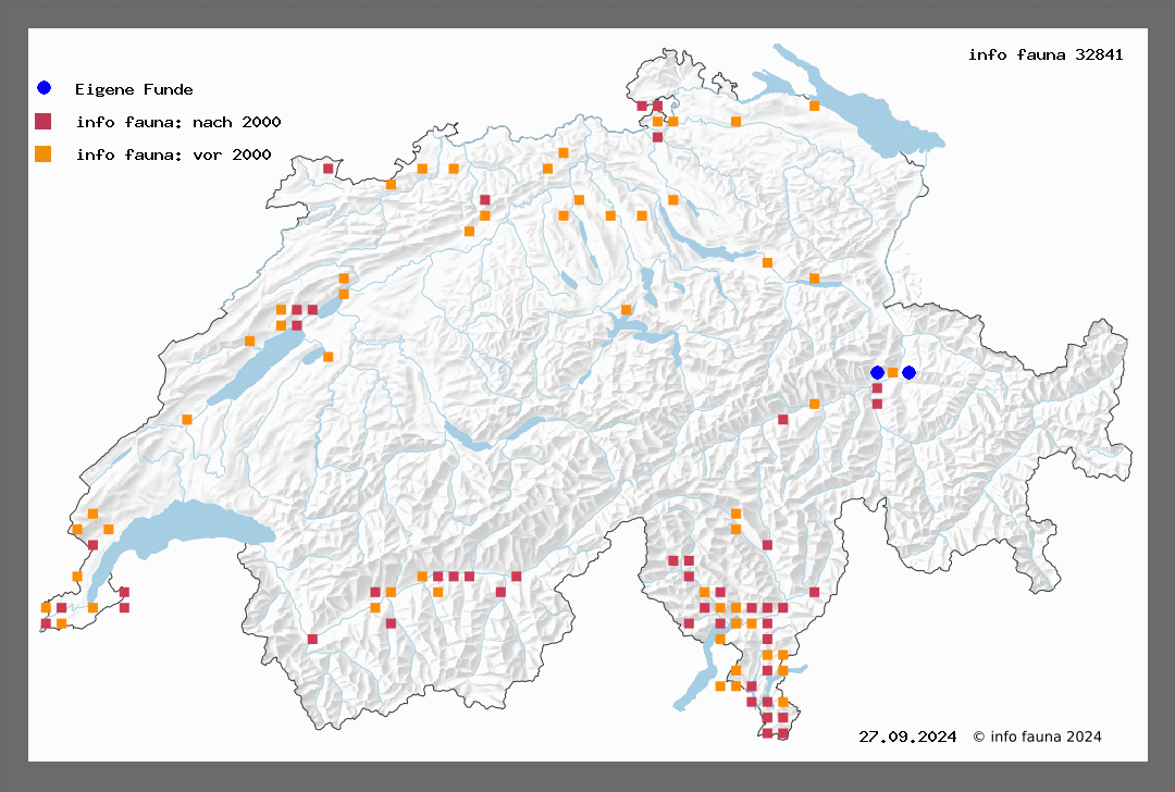 Der Falter fliegt in einer Generation im Juni-Juli; am Tage sitzt er kopfabwärts an Stämmen von Laubbäumen. Er ist weit verbreitet, aber mit Ausnahme des Wallis, recht selten. Chur (Cafl.), Warth (Wehrli), Zürich (V.), Zürichberg (Rühl), Bremgarten (Boll), Bechburg (R.-St.), Dombresson (Roug.), Geneve(Culot), Martigny, Fully (W.), Sion, Sierre(Paul).