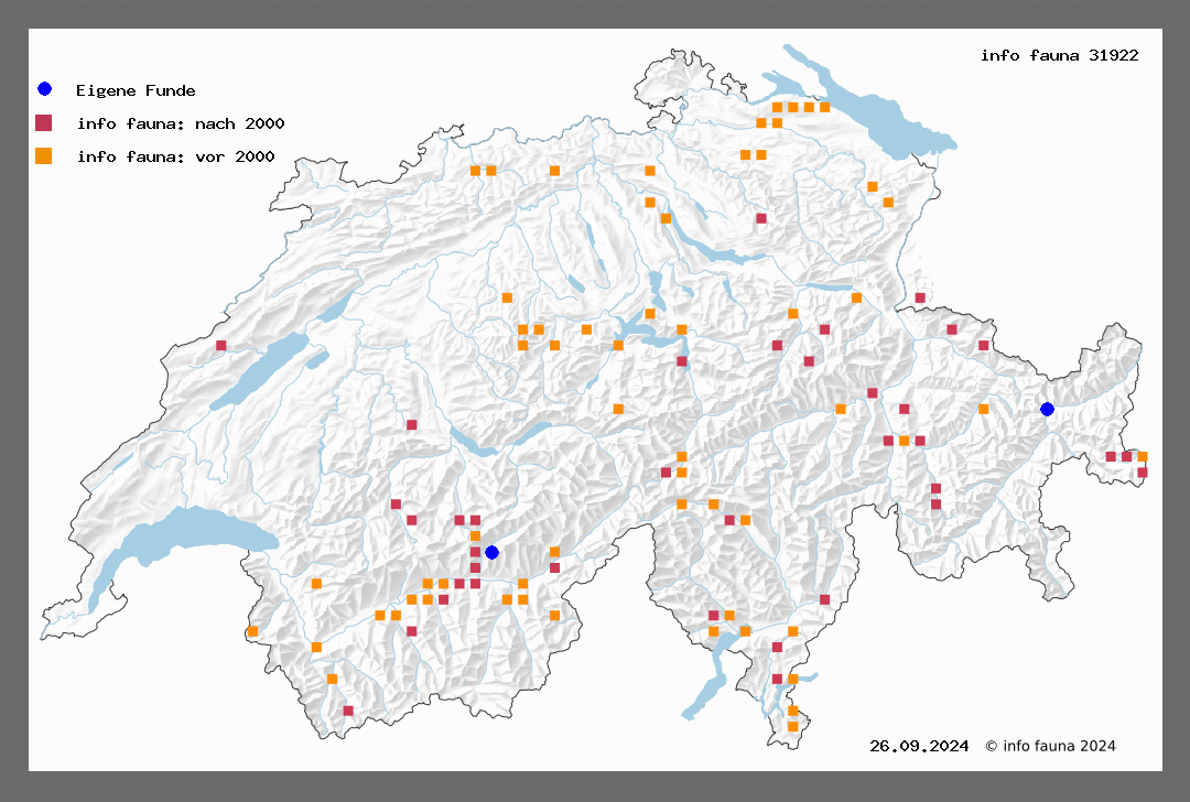 235. carmelita Esp. - Sp. III, T 22 - B. R. T 23 - Stz. II, T 46. Sehr selten und nur an wenigen Orten beobachtet. Flugzeit von April bis Juni. Zürich (Rühl, V.), Wallis (R.-St.), Davos (Boner), Aadorf (Z.-R.), Elgg (Gram.), Flums (Wild), Göschenen (Hoffm.). Die Raupen wurden von Müller in Sissach im Sommer 1900 von Birken geklopft, Entwicklung am 18. März 1901 (Seiler). Die Raupe - Sp. IV, T 20 - lebt an Birken von Juli bis Oktober. Die Eier werden auf die Unterseite der Blätter abgelegt, wo sich auch die ausgeschlüpften Räupchen sogleich festspinnen. Am besten gedeiht die Zucht, wenn die einige Tage alten Räupchen im Gazebeutel im Freien aufgebunden werden. Sobald sie ausgewachsen sind, was an ihrem fettig glänzenden Aussehen erkennbar ist, werden sie hereingenommen. Ende September oder Anfang Oktober gehen sie in die Erde und verpuppen sich dort in einer Erdhöhle. E. Ent. Jahrb. VI, 161 - Ent. Zeitschr. III, 91 - Soc. Ent. III, 9 - Sp. I. 99 - Frio. II, 326 - Favre 116.