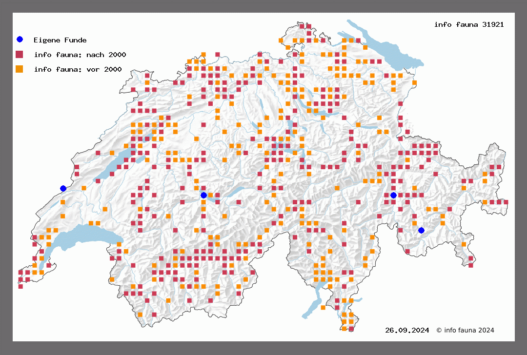 226. ziczac L. - Sp. III, T 22 - B. R. T 23 - Stz. II, T 45. Der Falter ist in allen tieferen Landesteilen verbreitet und häufig. Flugzeit von Ende März bis Mai und im August-September. Bei Zermatt einzeln, doch regelmässig am Licht und auch noch bis Riffelalp (2227m) aufsteigend (Püng.).