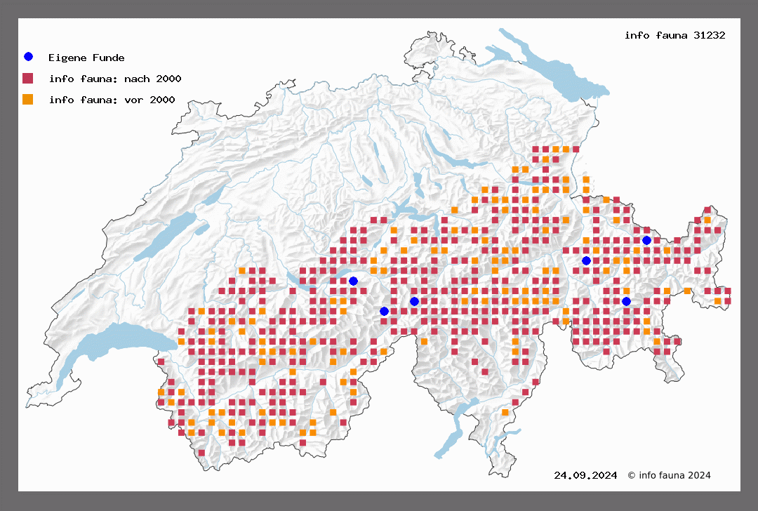 Lebenszyklus: | Entwicklung stets zweijährig. Die Raupe überwintert als L1 und L3. Flugzeit: Alljährlich Ende Juni bis Ende August. |