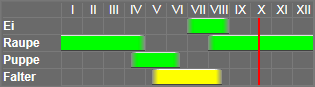 Die Raupe - Sp. IV, T 12 - lebt von Herbst bis Mai an niederen Pflanzen wie Urtica, Lamium, Myosotis, Cynoglossum, aber auch an Lonicera- und Salix-Arten. - Die