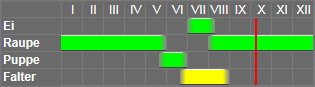 trockenen Zimmer; von Mai an werden die Raupen wieder regelmässig gefüttert. Sie verpuppen sich Ende des Monates zwischen Moos und dürfen dort nicht gestört werden. Die Falter erscheinen nach einigen Wochen. (Ent. Zeitschr. XX, 76). E. Sp. II, 9 - Frio. III, 134 - B. R. 313.