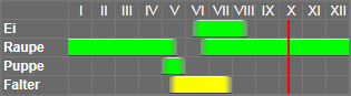 1241. strigillaria Hb. - Sp. III, T 65 - B. R. T 41. Diese Art ist ebenfalls an heissen, trockenen Stellen zu finden, aber recht selten und im Vorkommen beschränkt. Sie fliegt im Mai-Juni, gerne auf mit Heidekraut bewachsenen Waldblössen. Höhenverbreitung im Wallis bis 2000 m (Alpe de Fully, W.). Elgg (Gram.), Lägern (Rühl), Neuveville (Cour.), St. Blaise 5. VIII. 1906 (V.), Montagny (T. de G.), Branson, Follaterres (W.), Siderser- und Visperalpen (Favre), Lugano (Thom.), Promontogno, Calandaschau (Cafl.). Die Raupe - Sp. IV, T 44 - lebt von August bis Mai an Besenginster, Erica, Calluna, Senecio. Sie sitzt über Tag an den Zweigen der Futterpflanze halb eingerollt auf der Unterseite und lässt sich bei Berührung sogleich zur Erde fallen. Verpuppung in einem weichen Cocon zwischen den Wurzelstöcken der Nahrungspflanze. E. Favre 272 - Sp. II, 120 - Frio. III, 31 - Lamp. 273, T 78 - Schmett. Westf. 139 - B. R. 418.