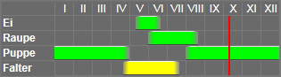 Die Raupe - Sp. IV, T 19 - lebt an Populus tremula und nigra im Juni-Juli und August-September, gerne an niederen Büschen.